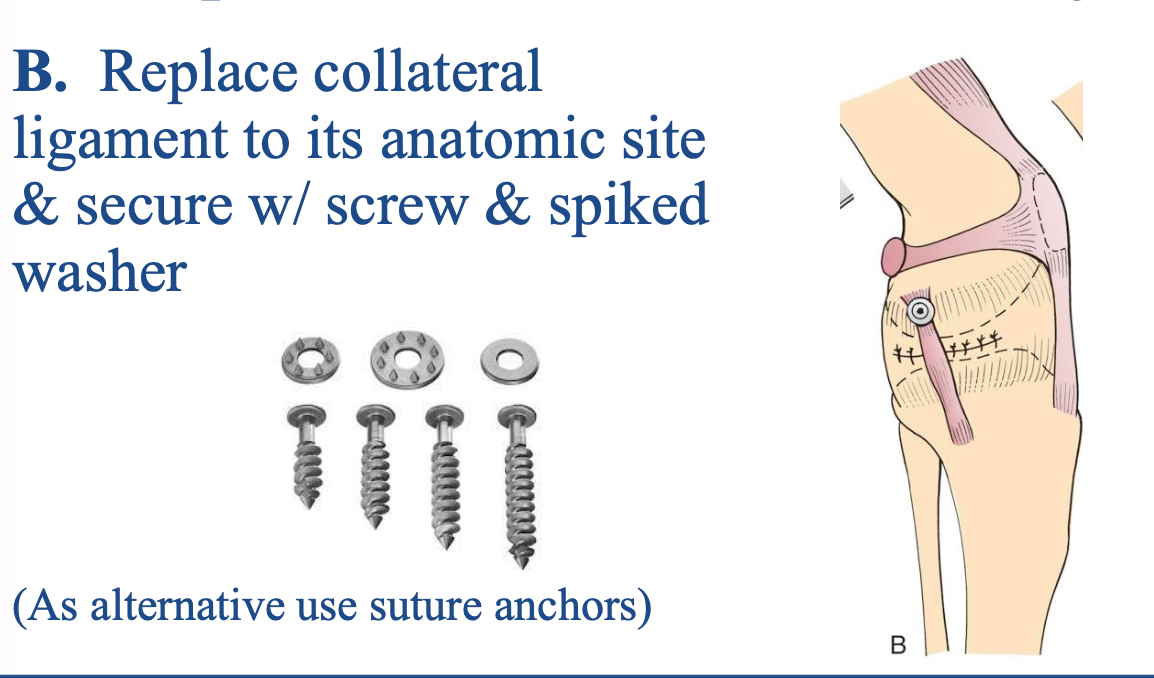 replace collateral ligament to its anatomic site and secure with screw and spiked washer
