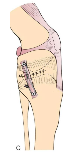 continue incision distally 4 cm below tibial crest parallel to joint line