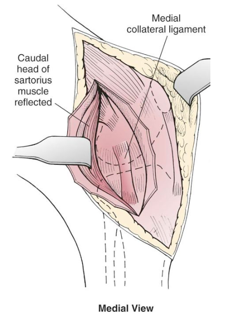 incise insertion caudal head of sartorius muscle and deep fascia along craniomedial border of proximal tibia