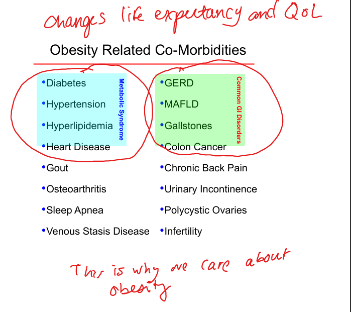 T2DM, HTN, hyperlipidemia, MAFLD, GERD, gallstones, OSA, OA, infertility, venous stasis, gout.