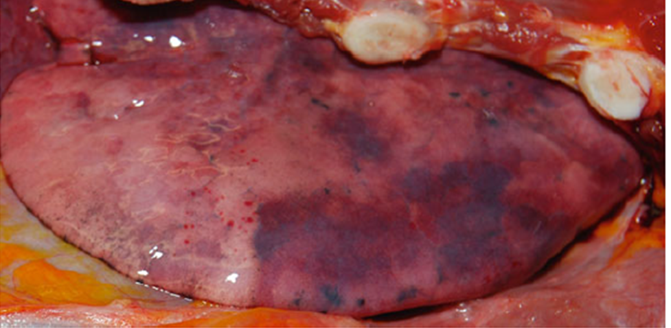 2- increase the intra-alveolar pressure with resulting rupture of the superficial unsupported alveoli of the lungs that appear under the pleura as shinny grey spots on examination by a hand lens in the postmortem bodies and they are called ‘Silvery Spots’.