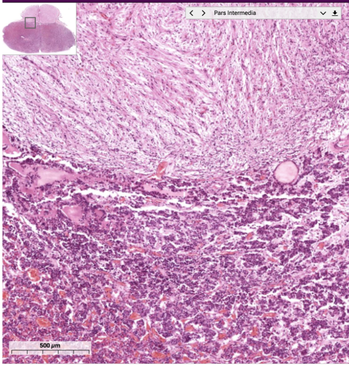 Composed of large round chomaffin cells arranged in short cords or clumps. Many capillaries viens and nerve fibers ‘