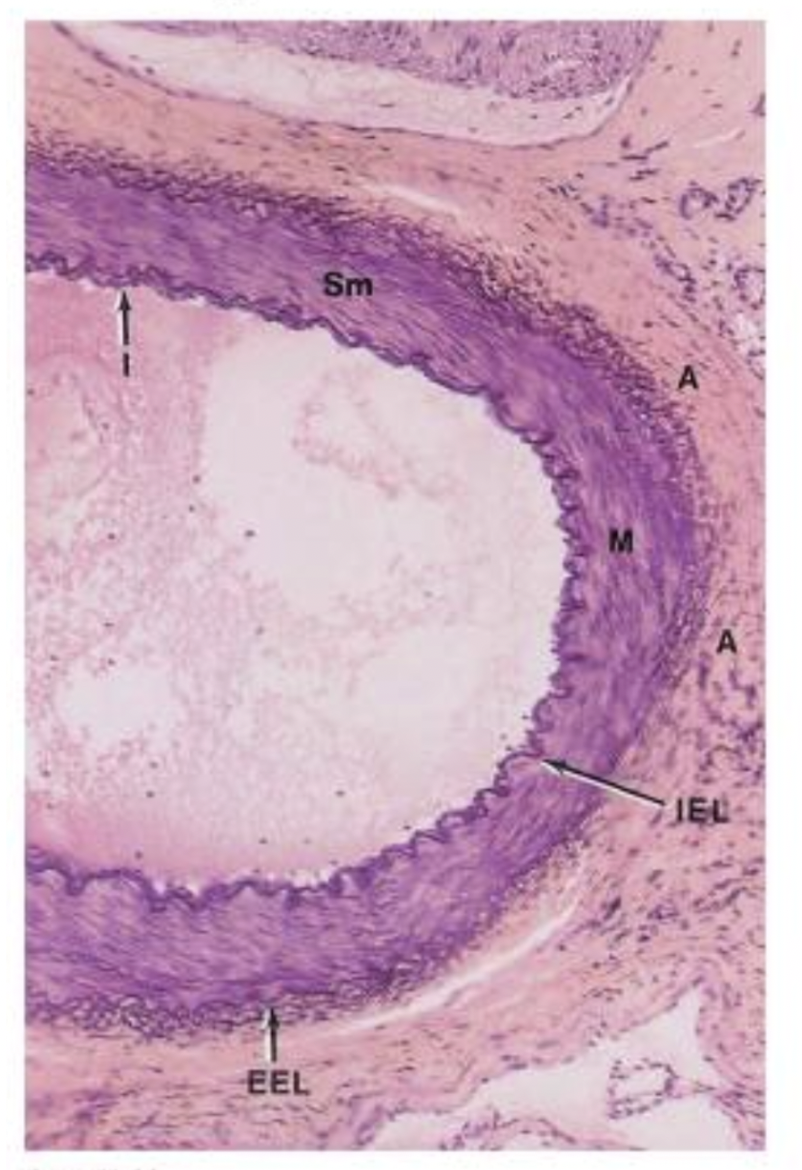 Less elastic lamellae more smooth muscle cells