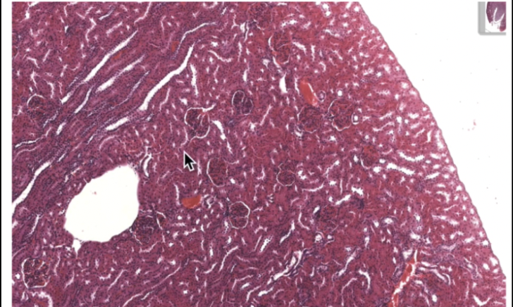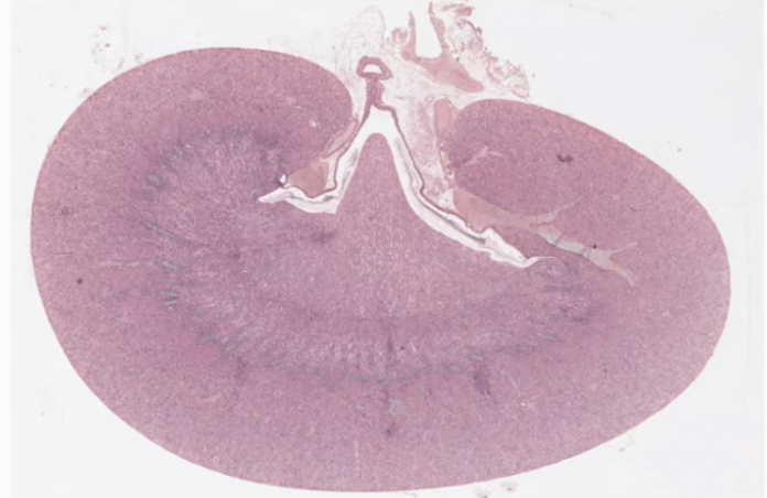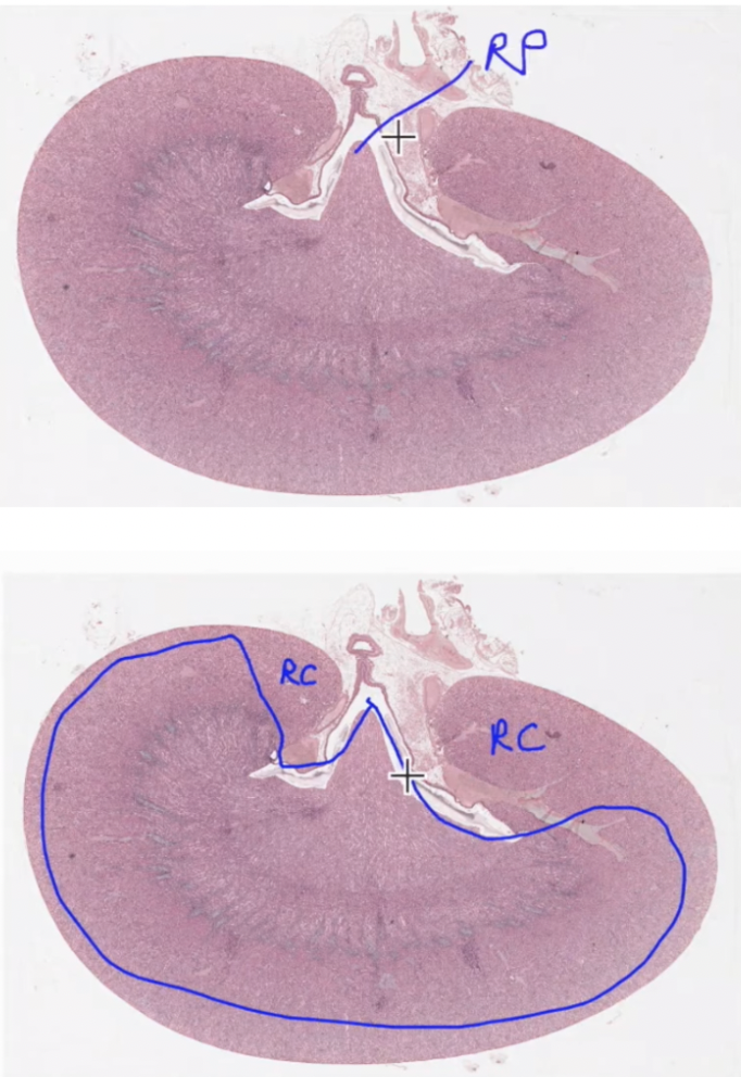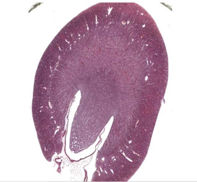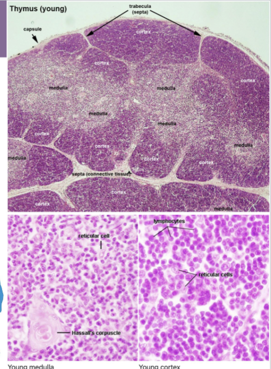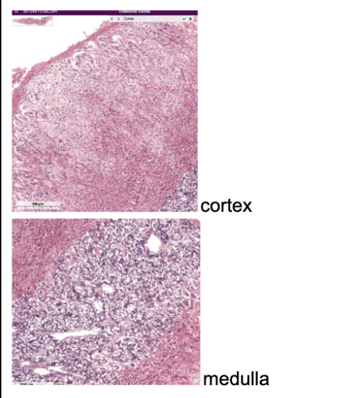 Each lobe has dense cortex and inner paler medulla