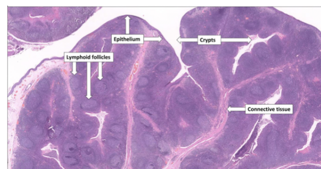 Crypts lined with lymphoid tissue and lympoid nodules