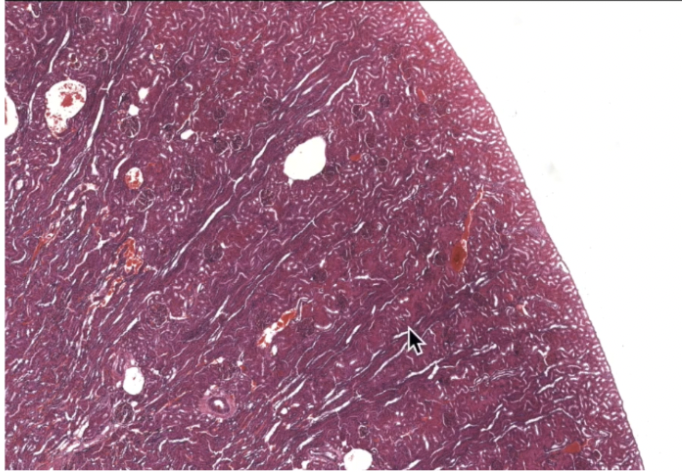 Nuclei in between lamellae (modified smooth muscle cells, secrete ECM)