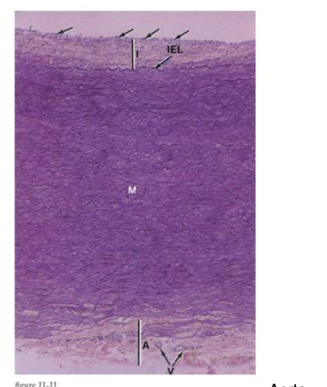 In the aorta, tunica media is thick and has lots of elastic fibers