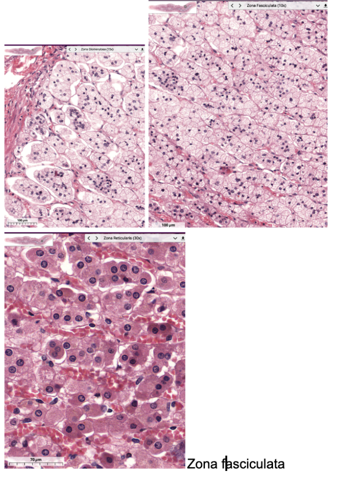 Secretory cells form cords divided into 3 layers