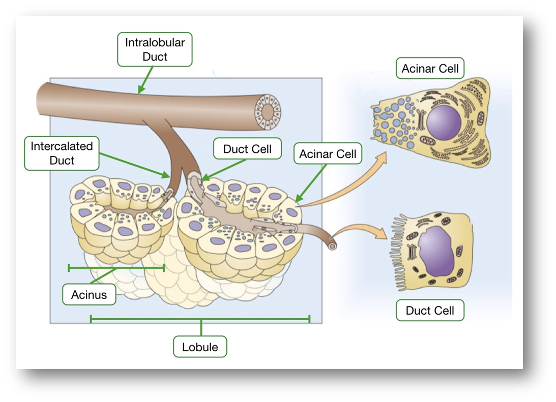 •Comprises of the acinar cells (75-90% mass) and ductal cells (5%)