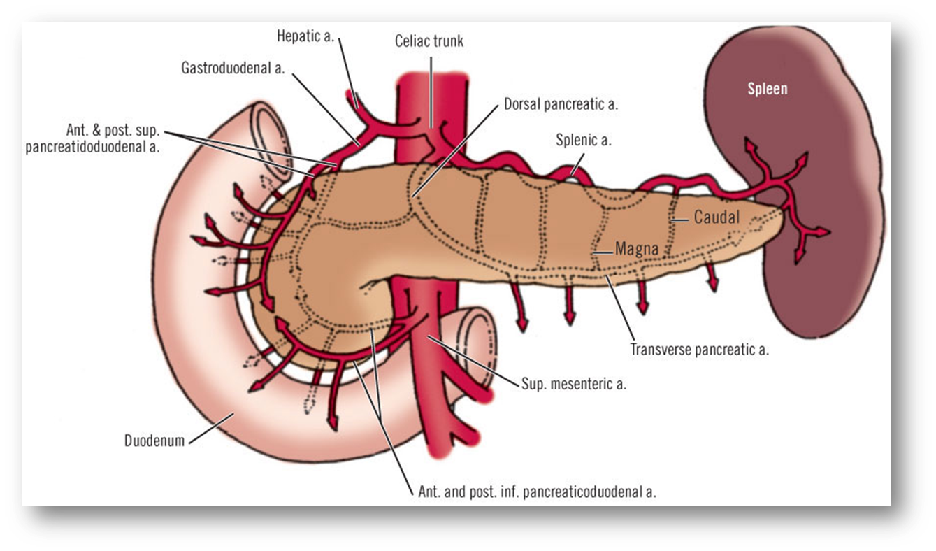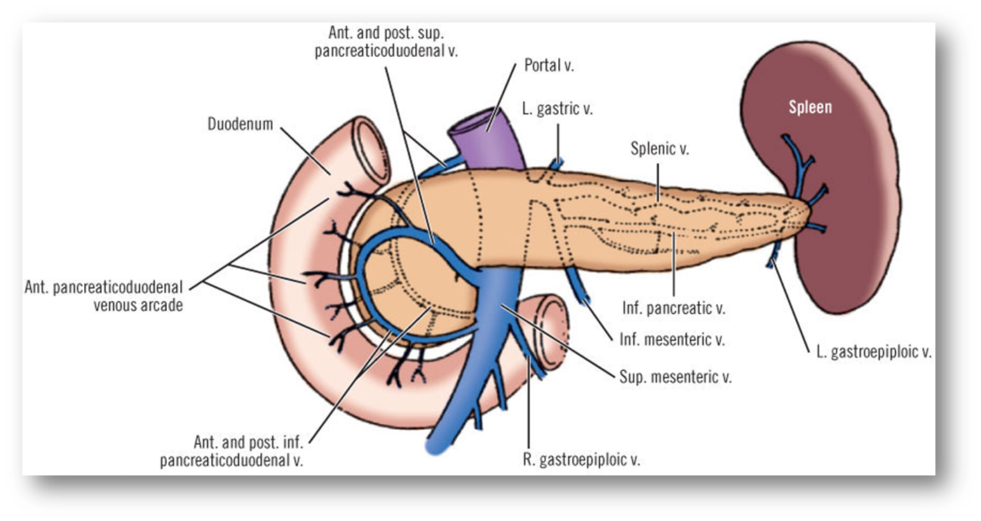 •25cm long, C-shaped, around the pancreas, vertebral level L1-3