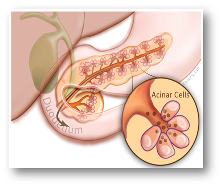 EXOCRINE FUNCTION- Acinar cells secrete pancreatic enzymes