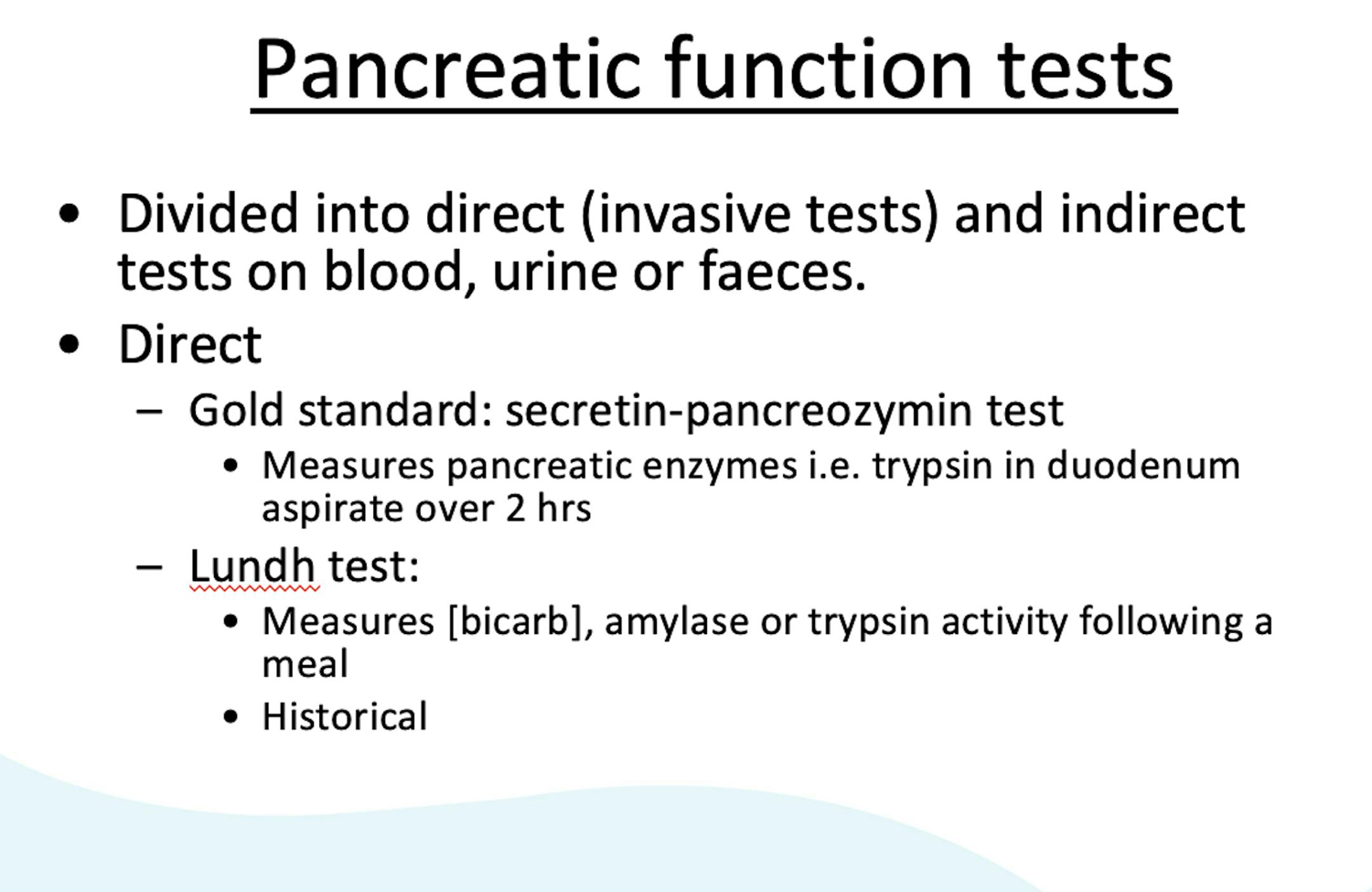 •Direct test – monitor the actual secretion of pancreatic exocrine products (e.g. enzymes or bicarb)