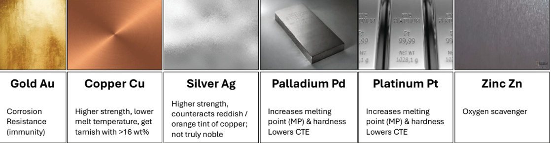 Palladium (Pd) and Platinum (Pt): Increases MT, lowers CTE, increases hardness
