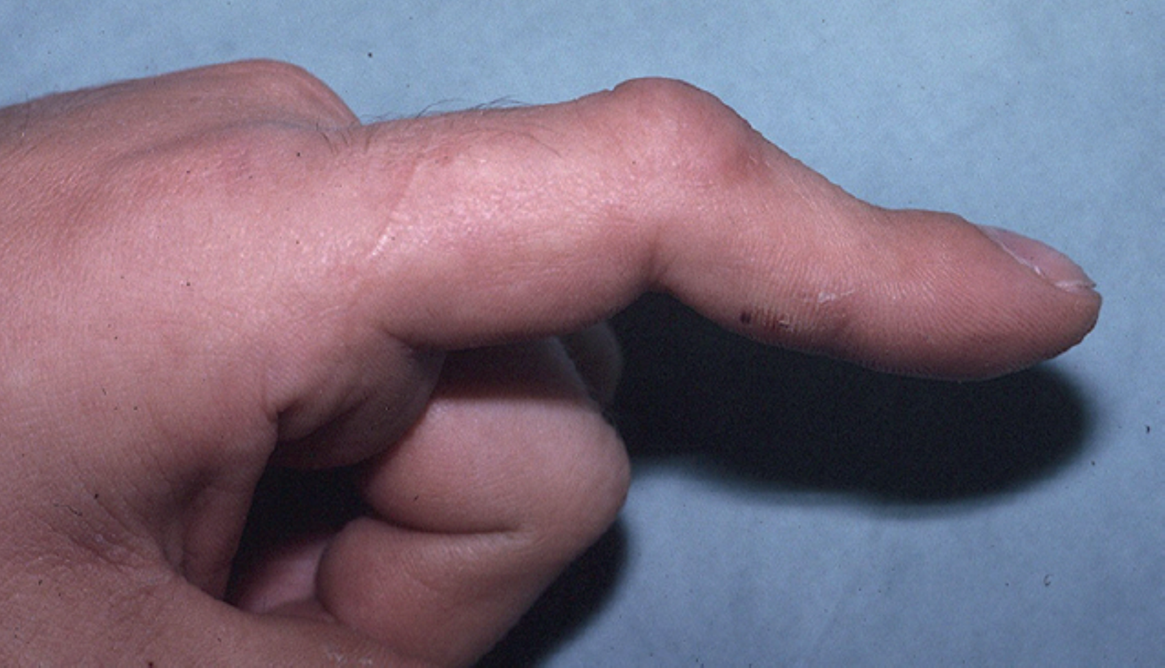 boutonnière deformity - Flexion of the proximal interphalangeal joint and hyperextension of the distal interphalangeal joint