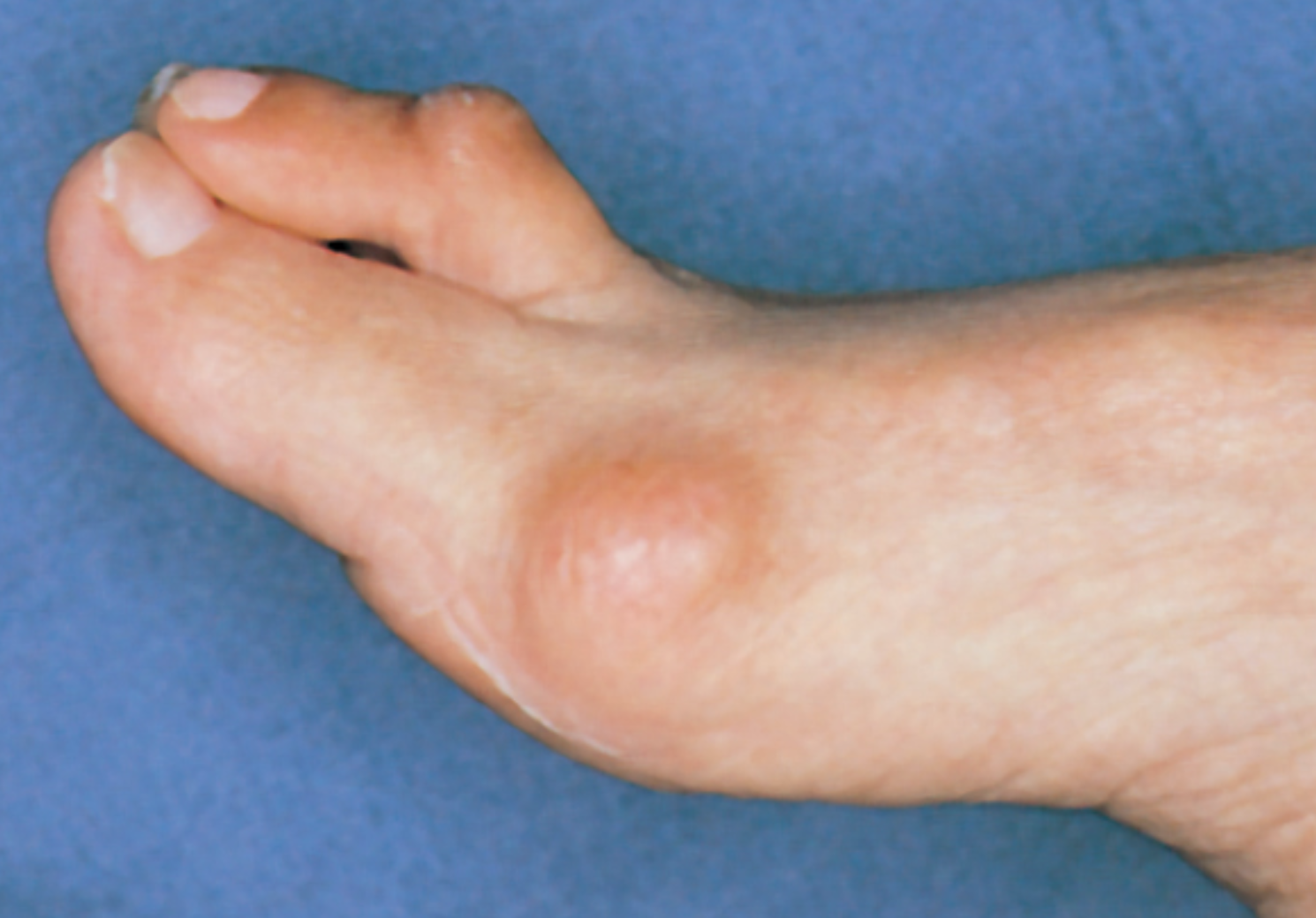 abnormality in which the great toe is deviated laterally and may overlap the second toe. An enlarged, painful, inflamed bursa (bunion) may form on the medial side