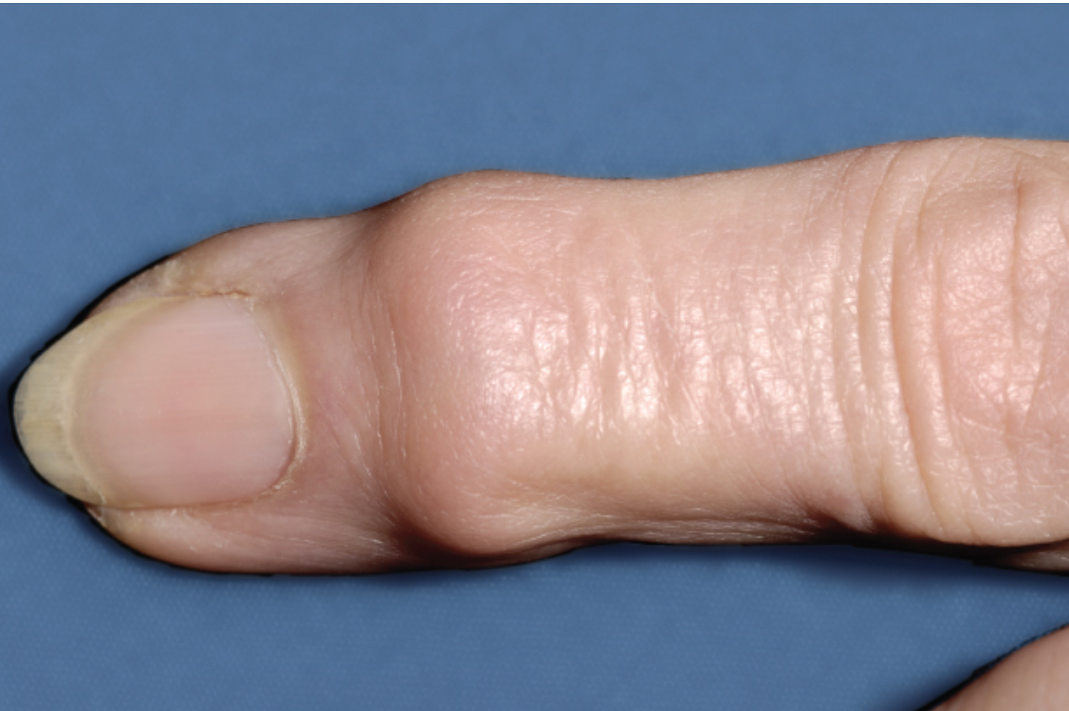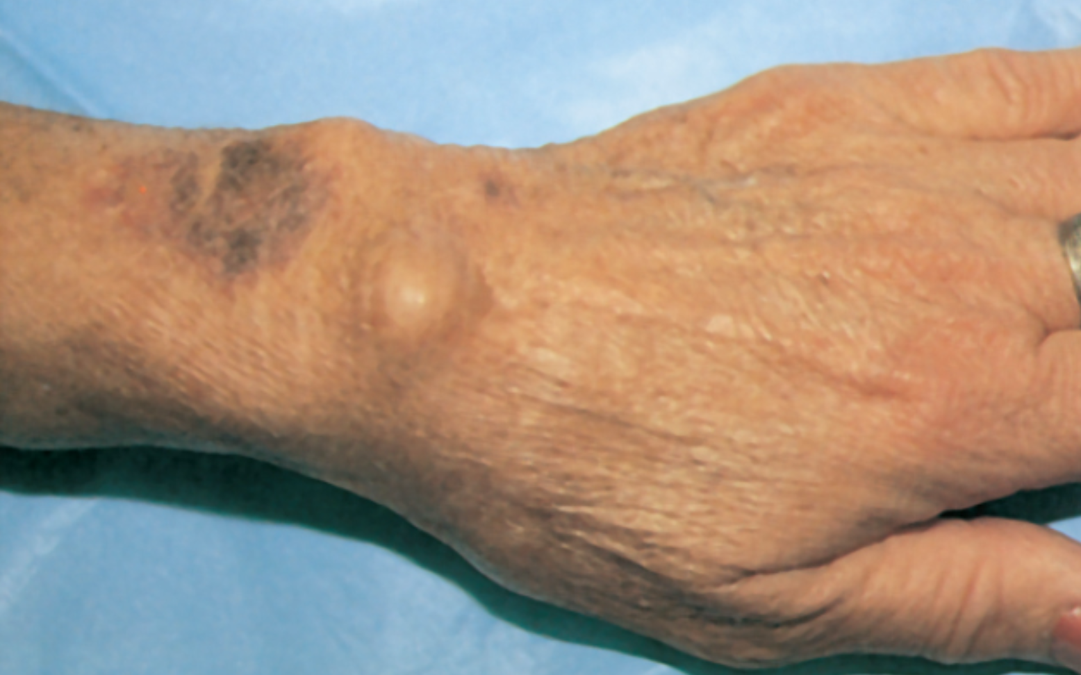 ganglion - Nontender, round, enlarged, swollen, fluid-filled cyst (ganglion) is commonly seen at the dorsum of the wrist