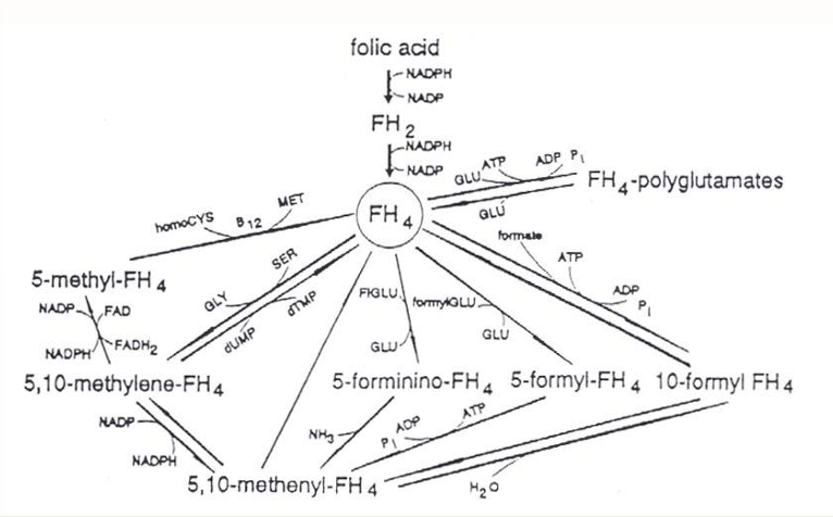 in plants and animals as polyglutamyl derivates of tetrahydrofolic acid (FH4)