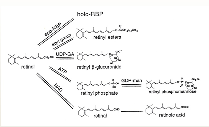 Esterification | retinol < - > retinyl esters | storage vitamin A (liver) |