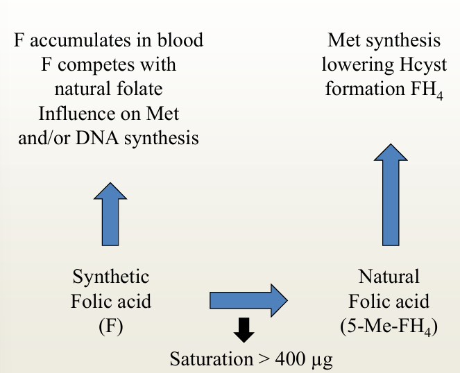 High intake of synthetic folic acid (>400 µg) can lead to accumulation of unmetabolized folic acid in the blood, competition with natural folates, and masking of vitamin B12 deficiency.