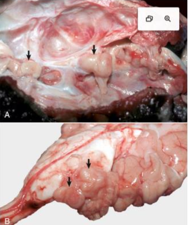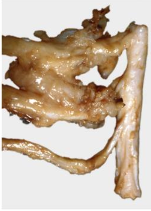 What is this? note the thickening of spinal nerve roots and fibers with tan brown tissue.