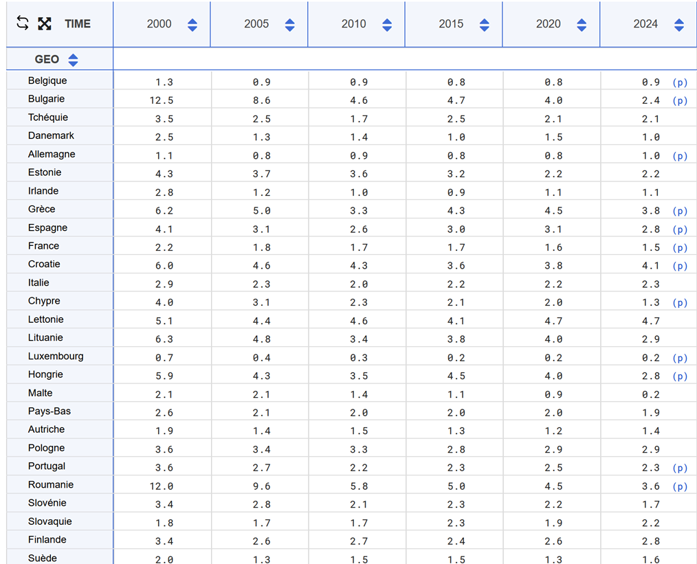 Grandes disparité de cet indicateur phare malgré une intégration économique, mais phénomène de rattrapage en terme d'activité économique sur le territoire (ROU, POL...), donc homogénéisation en général.