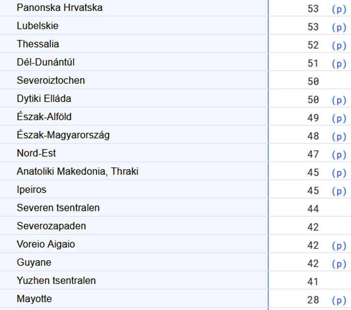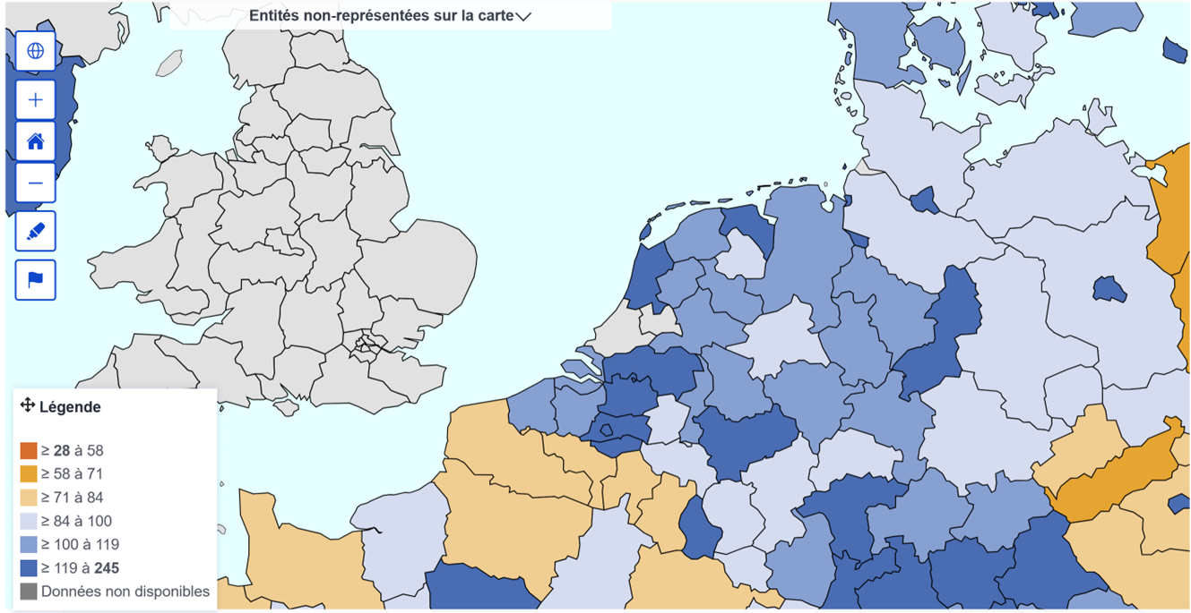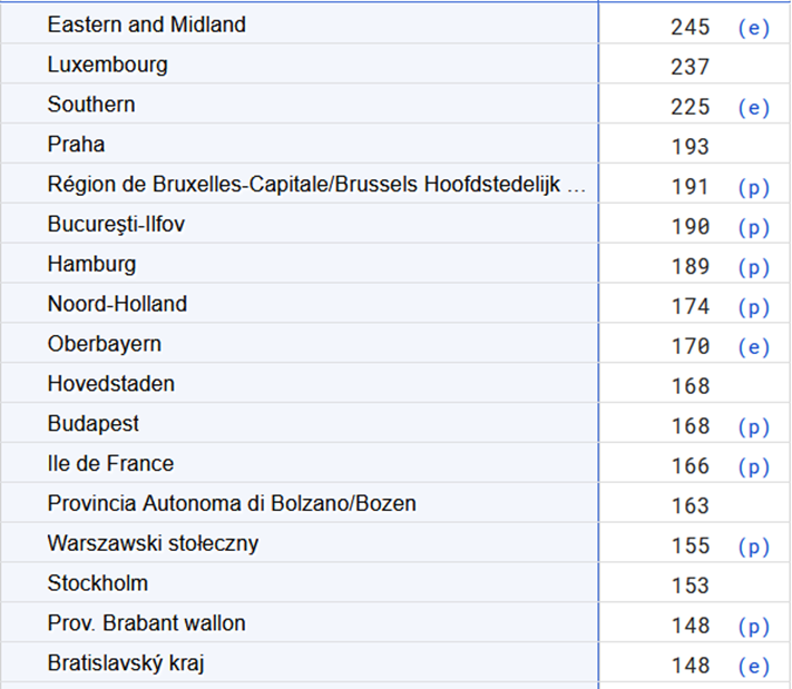 Le PIB peut aussi se mesurer à l’échelle régionale. Régions capitale, … Inner London = 600 en 2016 (quand encore dans UE), et Bruxelles = 204, Vienne 143, Berlin 123. Différences plus grandes entre les régions qu'entre les pays.