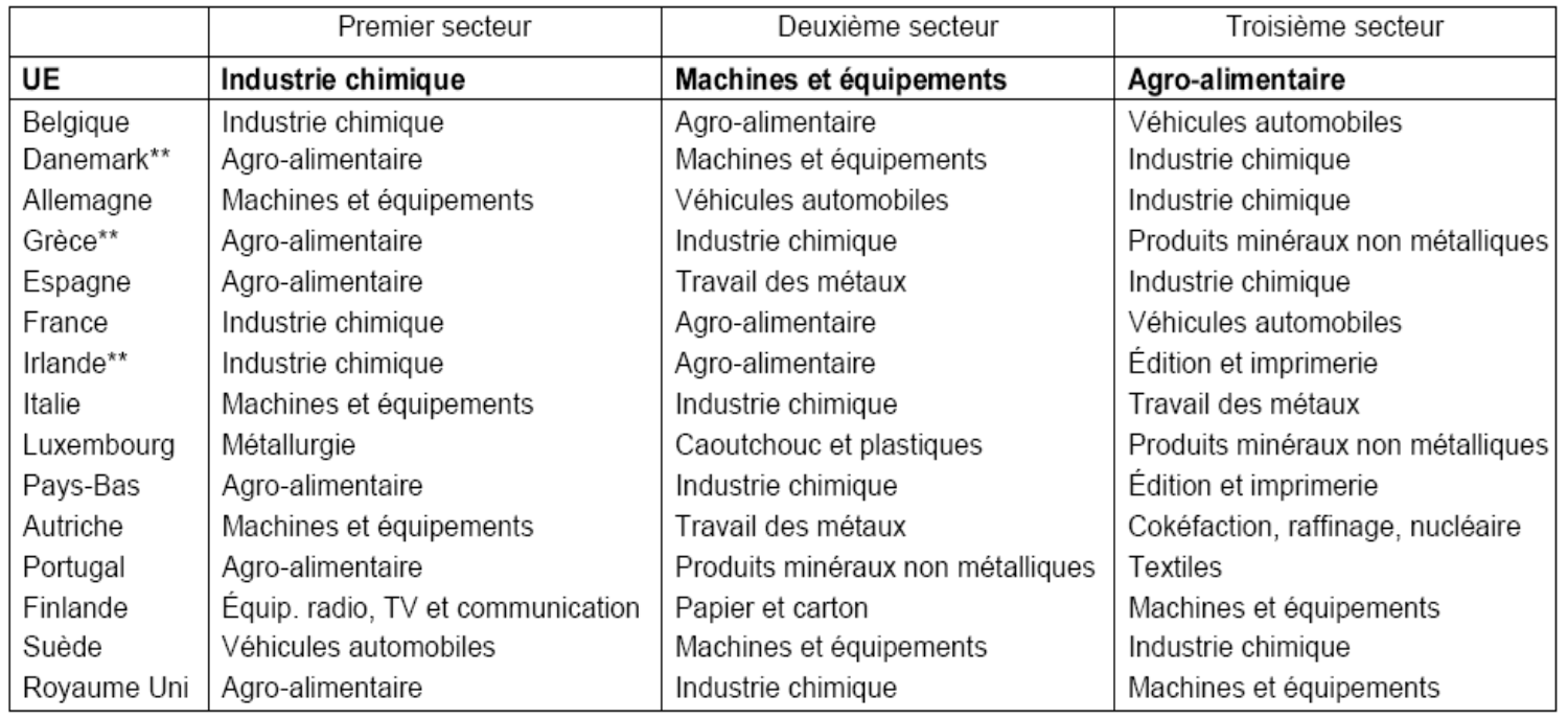 Les trois principaux secteurs manufacturiers de chaque pays, classés selon leur valeur ajoutée, 1999