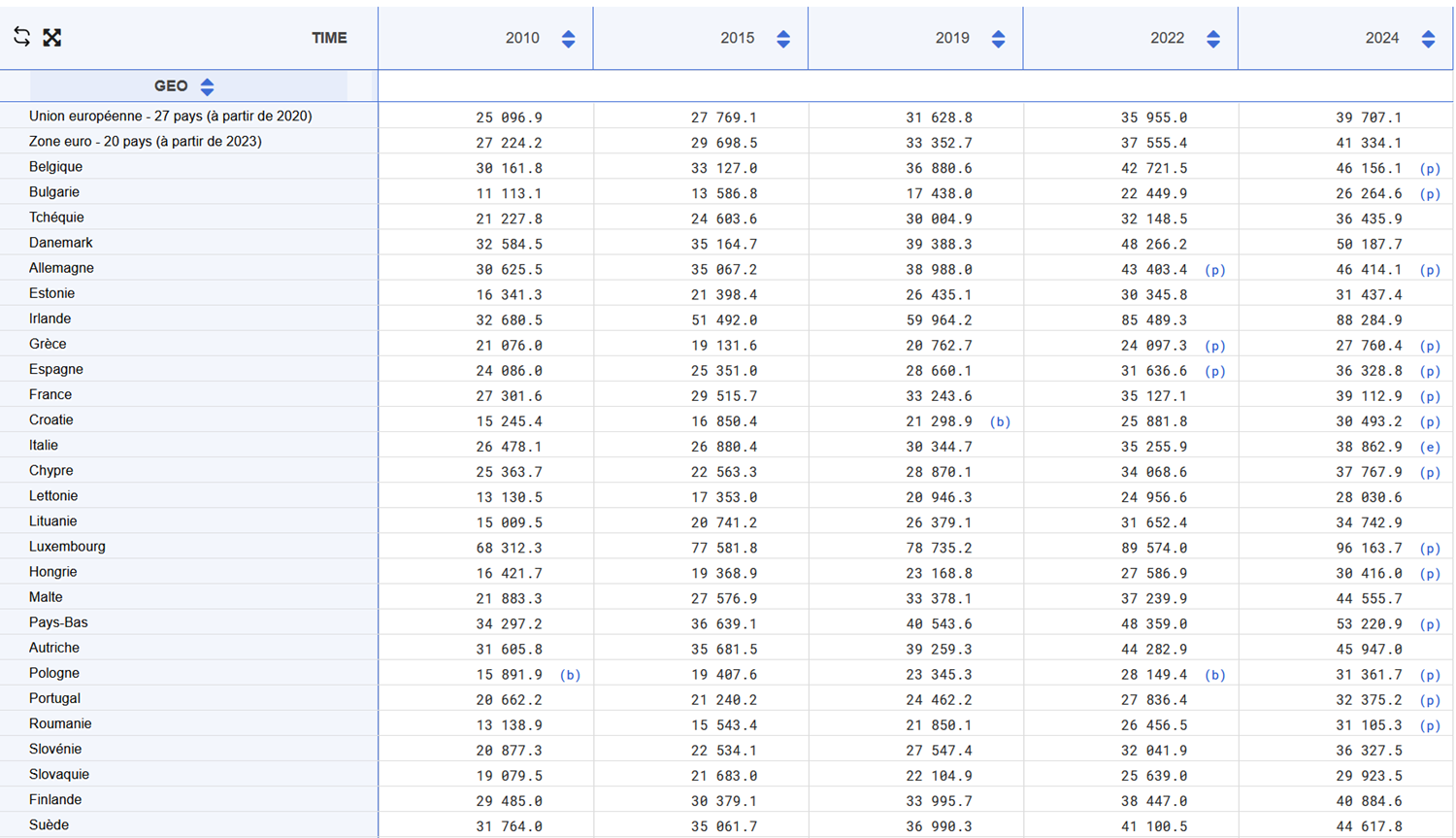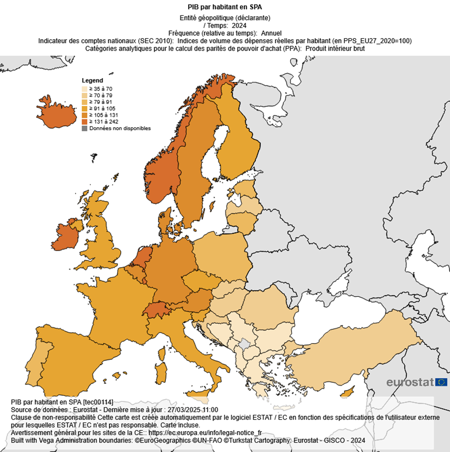 PIB par habitant (en SPA) en % de la moyenne EU-27