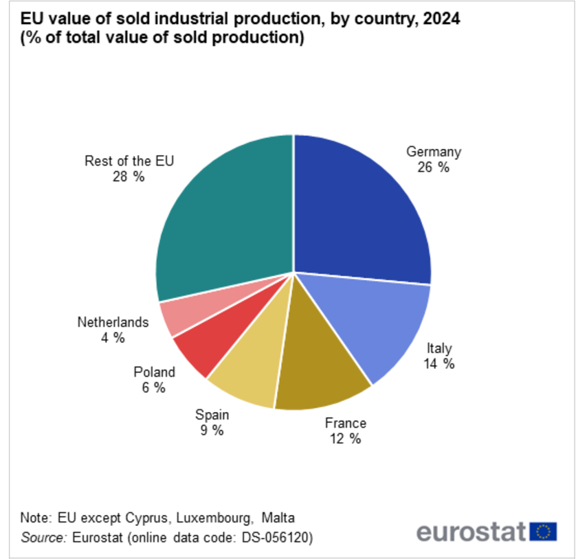 En 2023, la valeur de la production industrielle vendue dans l’Union européenne s’élevait à € 5 860 milliards d’euros. Six États membres de l’UE ont généré 72 % de la valeur de la production vendue de l’UE (dans UE et export)