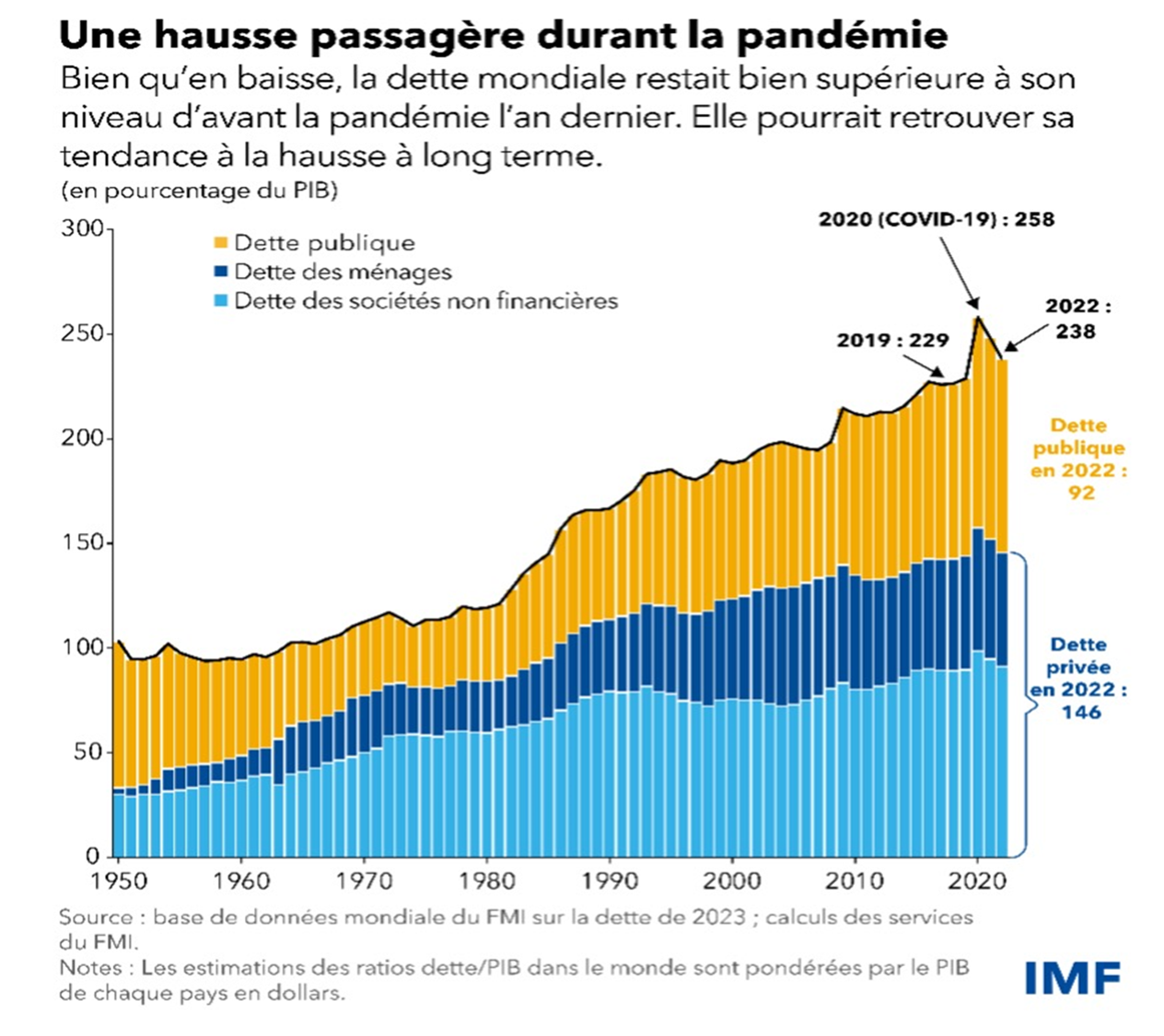 Monde : tendance similaire, stabilisation jusqu'en 80, puis augmentation, pic en 2020 (covid). Endettement public particulièrement, mais tous les endettements en général sont en hausse.