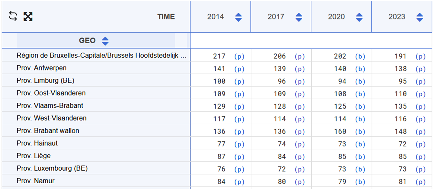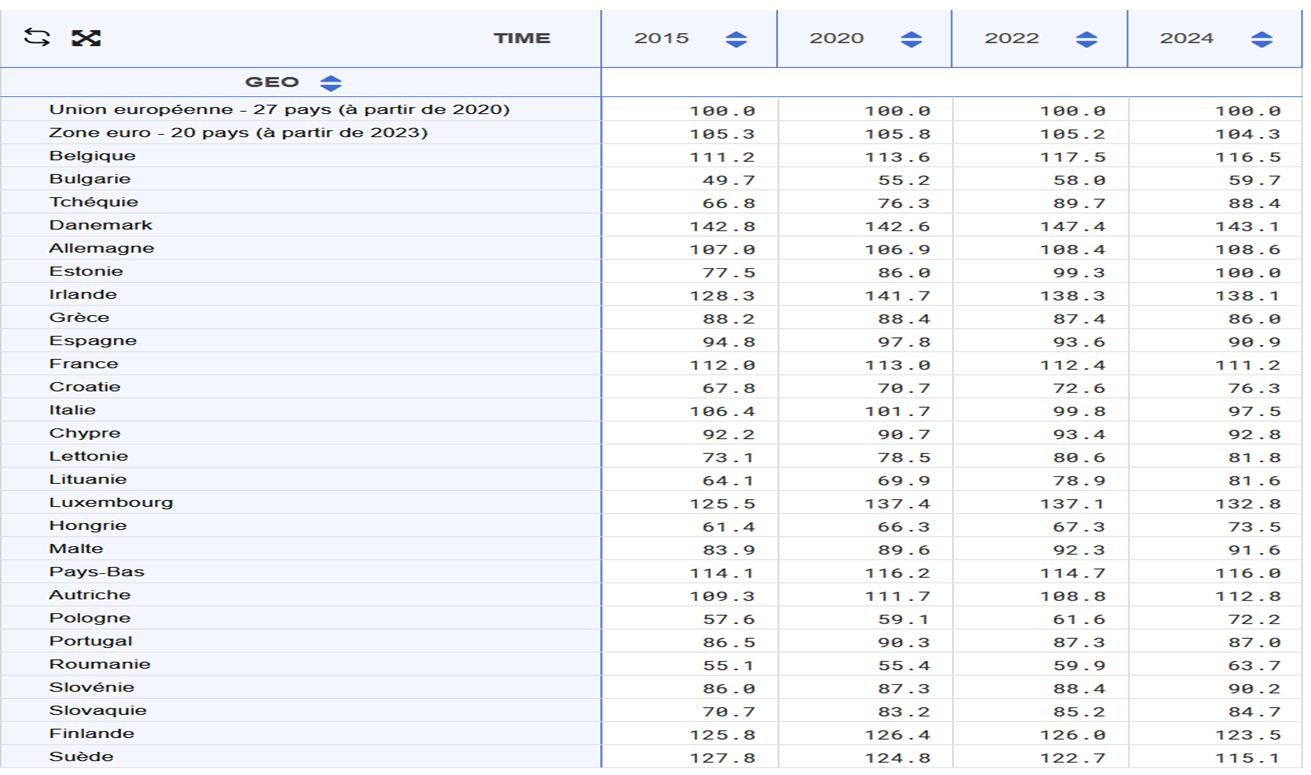 Que représente le même panier dans chaque pays, quel est le prix du même panier. 100 = moyenne en UE, donc en BE plus élevé ailleurs, cout de la vie est plus élevé que le moyenne européenne (au niveau des prix, on peut regarder les revenus par exemple qui seront surement aussi supérieurs à la moyenne européenne).