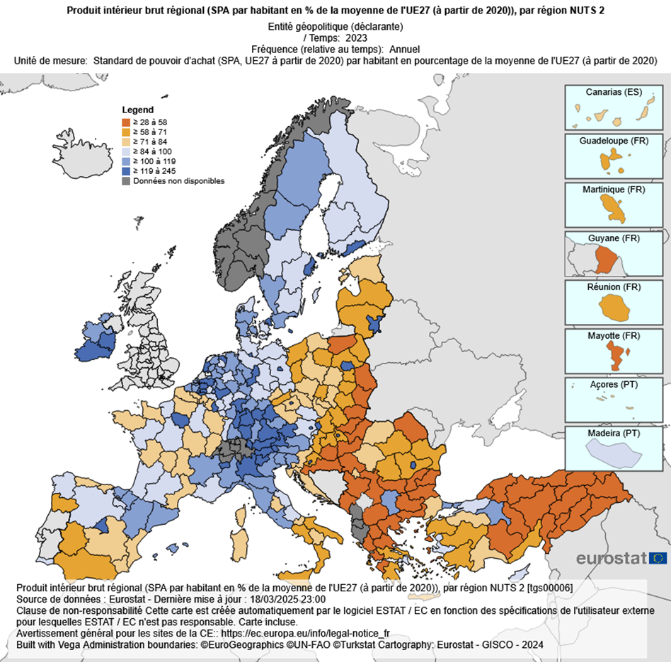 Produit intérieur brut régional (SPA par habitant en % de la moyenne de l'UE27 (à partir de 2020)), par région NUTS
