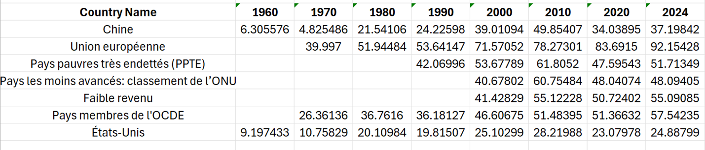 Degré d'ouverture aussi en augmentation dans des pays à faibles revenus, plus grand que les USA (qui sont globalement peu ouverts au commerce international)