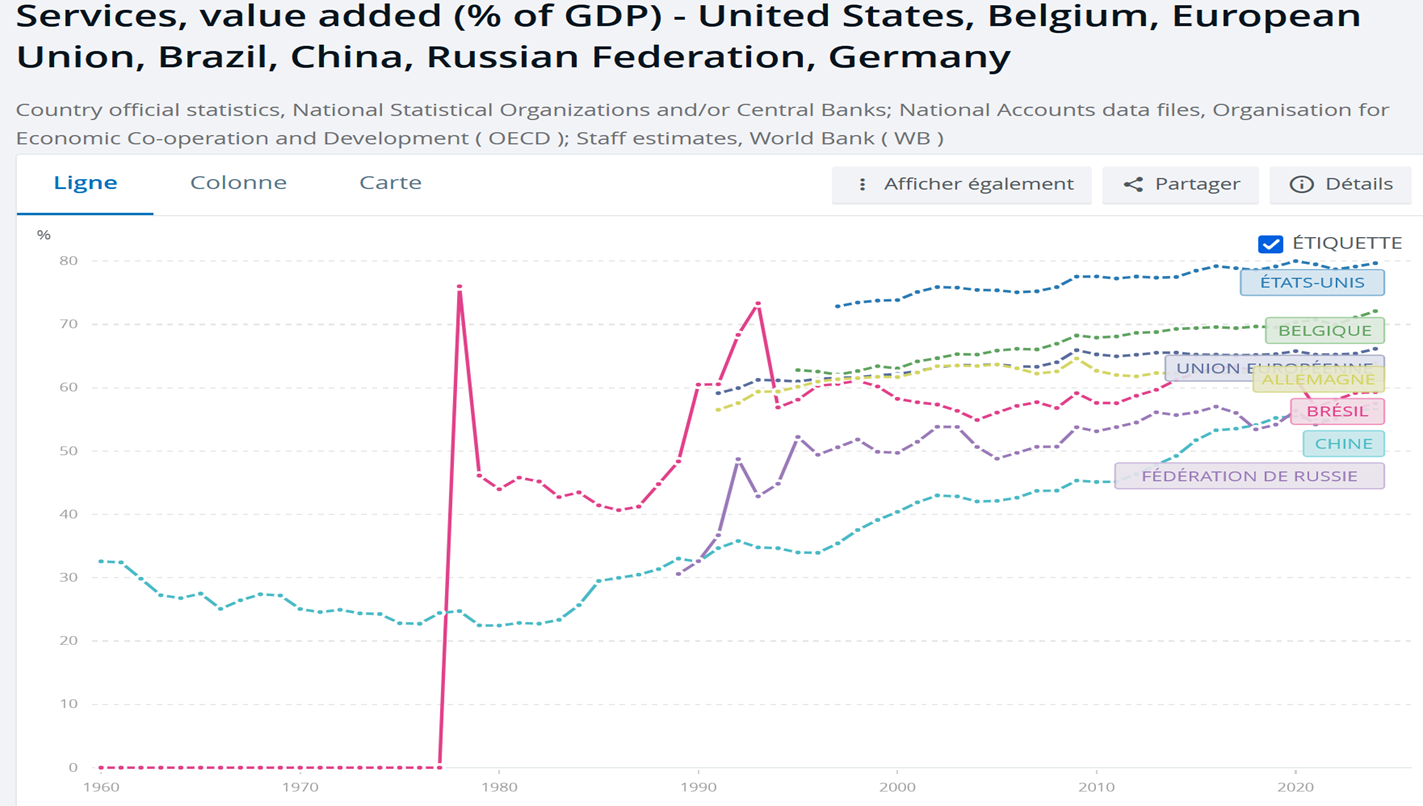 Valeur ajoutée du secteur tertiaire en augmentation, surtout pour la Chine, le Brésil et les pays davantage développés en terme de PIB