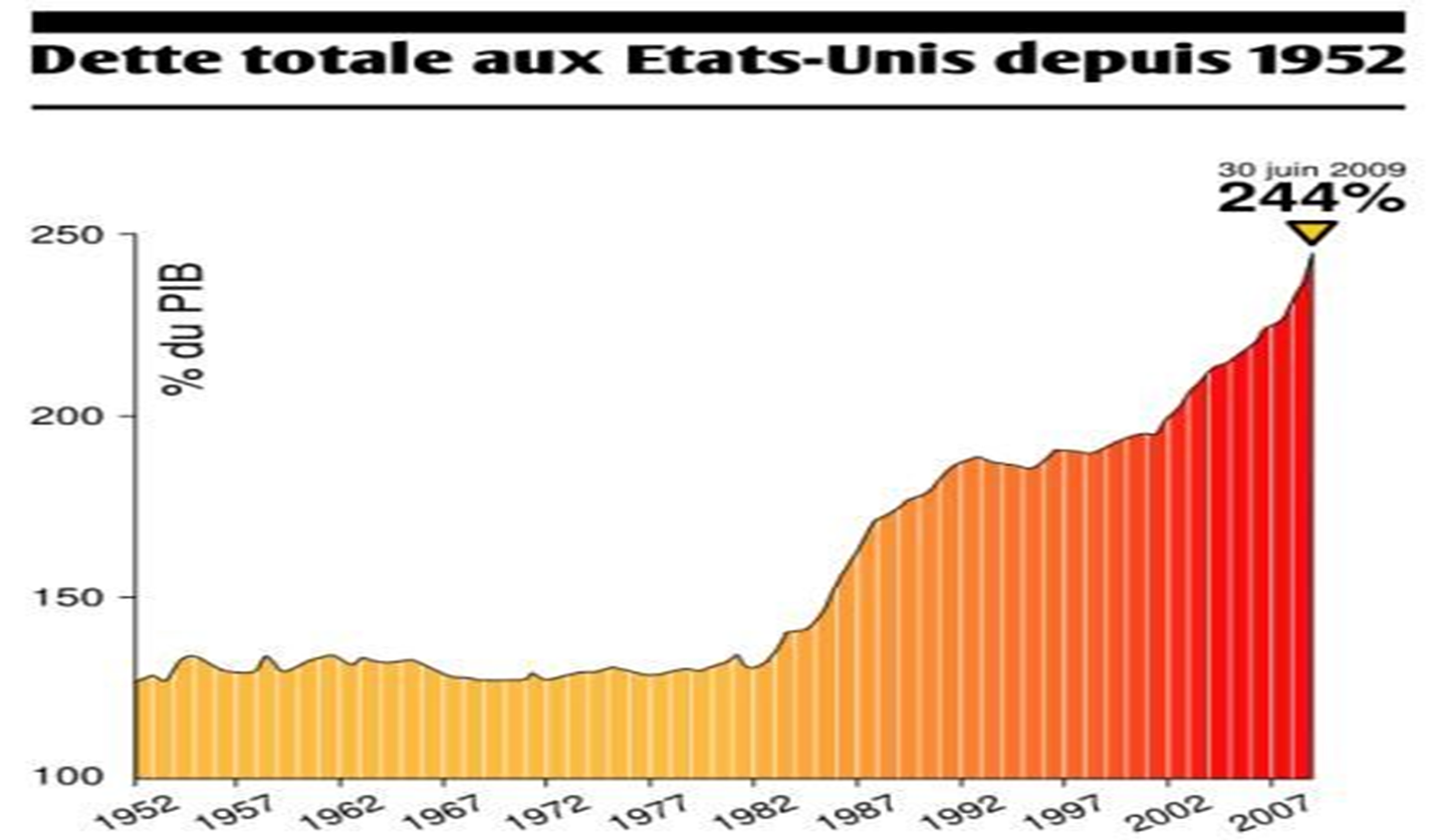USA : dette relativement stable, réalisé sans endettement, puis explosion début des années 80 : arrivée des républicains au pouvoir, ici les hausses sont pendant les administrations républicaines, puis se stabilise en démocrate, puis Bush ça recommence à augmenter