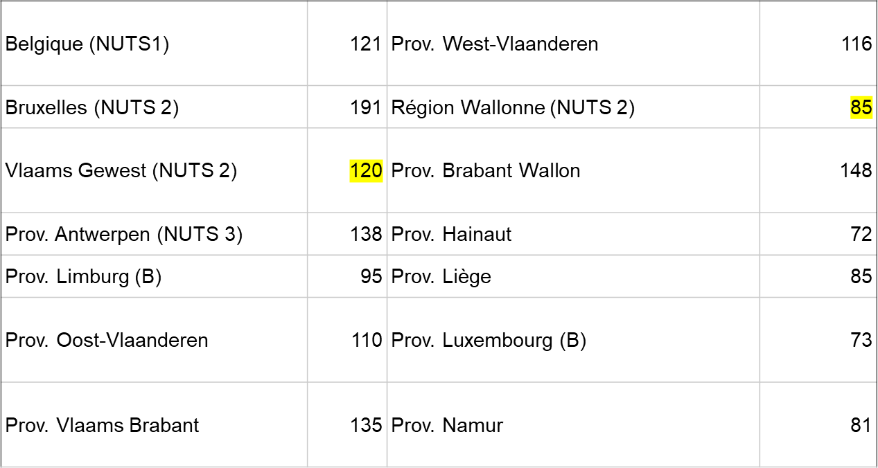 • Pareil pour les petites régions : région bruxelloise la plus riche en PIB mais en fait beaucoup de pauvreté. On produit beaucoup à Bruxelles, mais tous les navetteurs wallons, flamands, européens participent à ce PIB mais ne sont pas dans le dénominateur du nombre d'habitants. souvent les capitales sont les premières dans les classements par régions