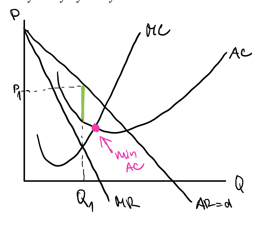 Vyrábí sice optimální objem produkce pro maximalizaci zisku, ale tento objem je menší, než ten, při kterém by dosáhla minima LAC, a část výrobních kapacit tak zůstává nevyužitá.