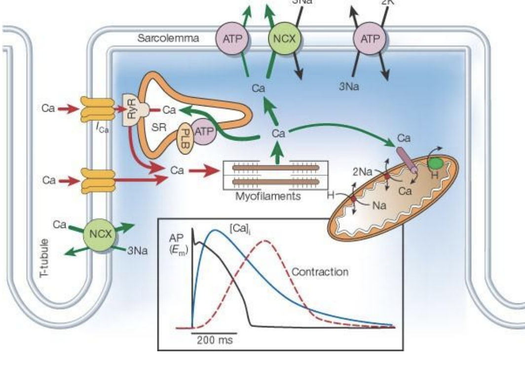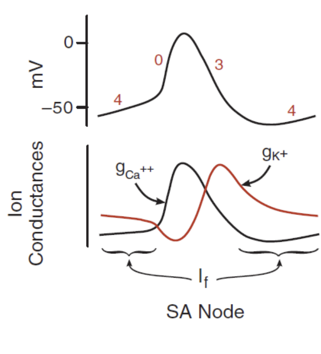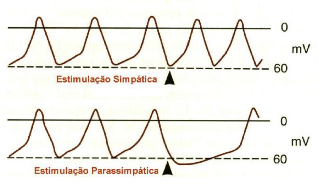 Efeito cronotrópico negativo (SA) - acetilcolina abre canais de cálcio e obriga a um falso repouso, obrigando o potassio a sair → obriga a fase 4 a durar mais tempo