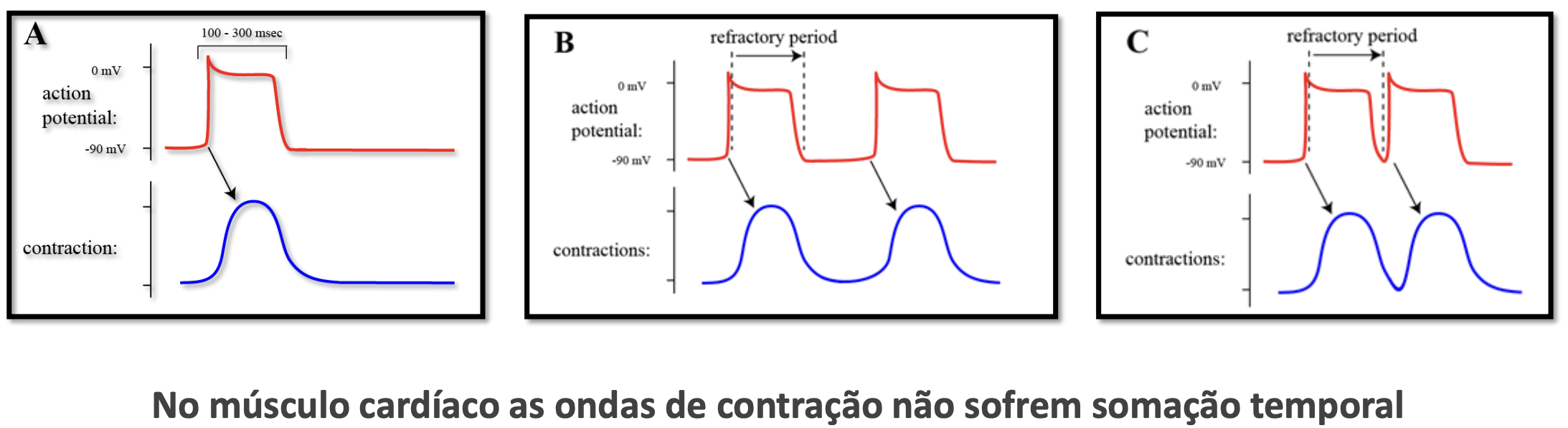 uma consequência mecânica do período absoluto longo é estar a acontecer quase de seguida um abalo, que dura quase o mesmo que o potencial, mesmo que a frequência aumente tem a haver um intervalo nos potenciais e não pode haver somação nem tetania no miocárdio.