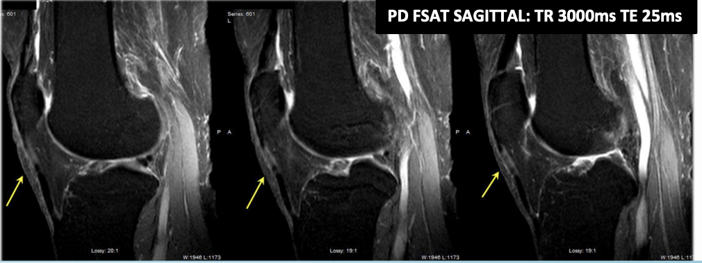 a tendon or ligament is positioned approximately 55° to the direction of the main magnetic field, and a short TE value pulse sequence is utilized., sometimes longer flip angles