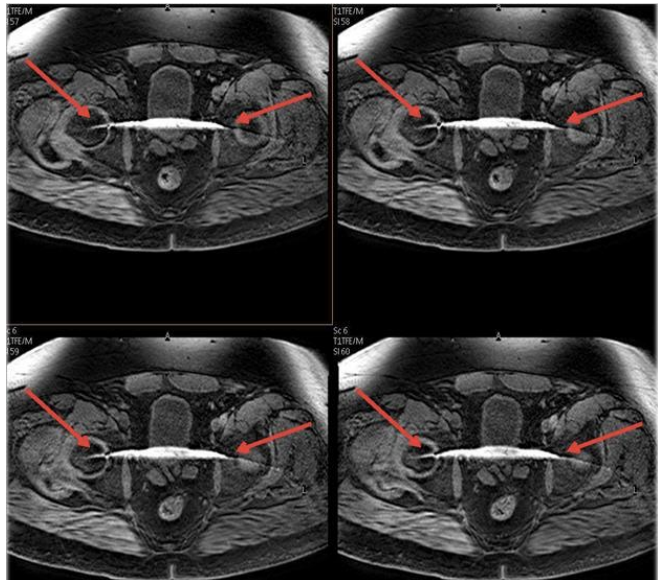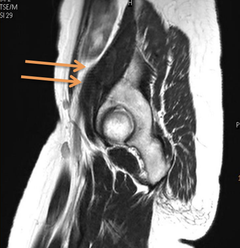 confirmation of magic angle artifact, instead of tendinopathy, is made by the utilization of a long TE sequence, where the long T2 relaxation time of the collagen fibers will not yield high signal in the tendon at the 55° angle to the magnet.