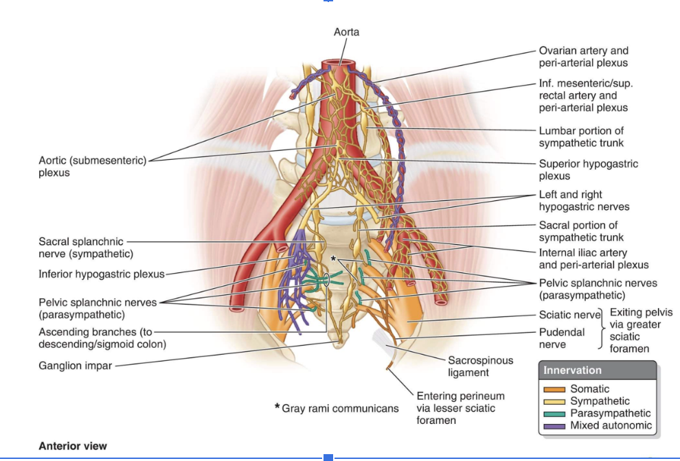 Where do parasympathetic fibers enter to reach pelvic organs?