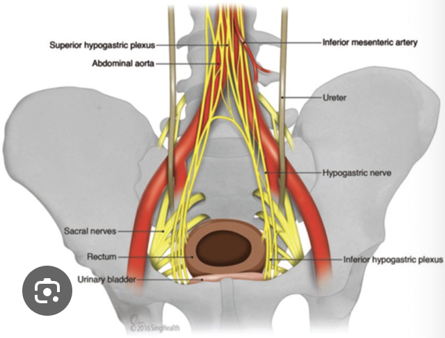 Bladder, uterus, vagina, prostate, seminal vesicles, and the distal ureter.