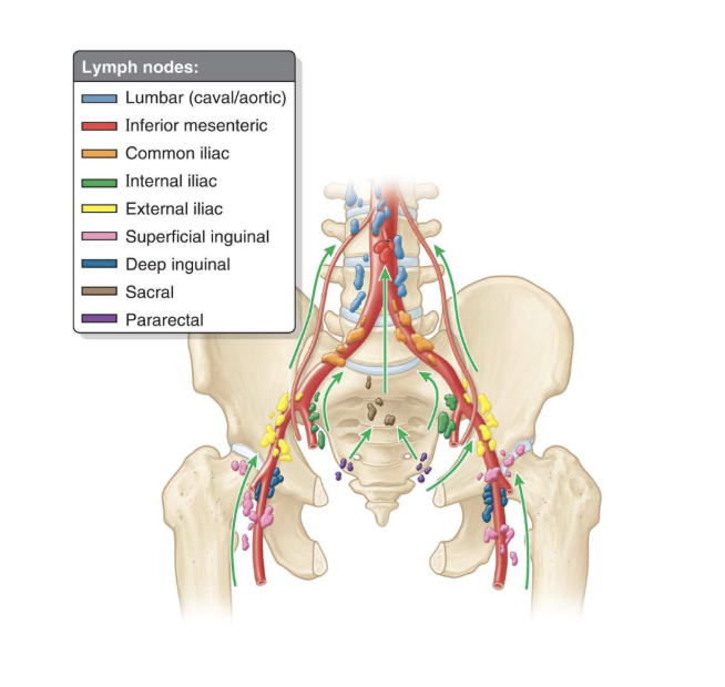 Internal iliac → Common iliac → Lumbar nodes → Cisterna chyli → Thoracic duct.