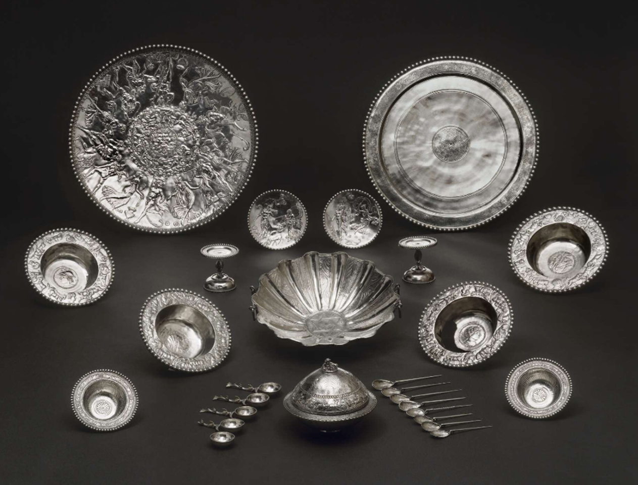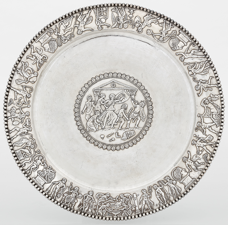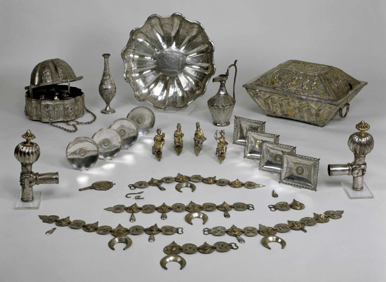 Priam carrying the treasure while on the cup the treasure is brough in by attendants