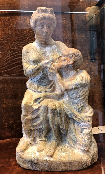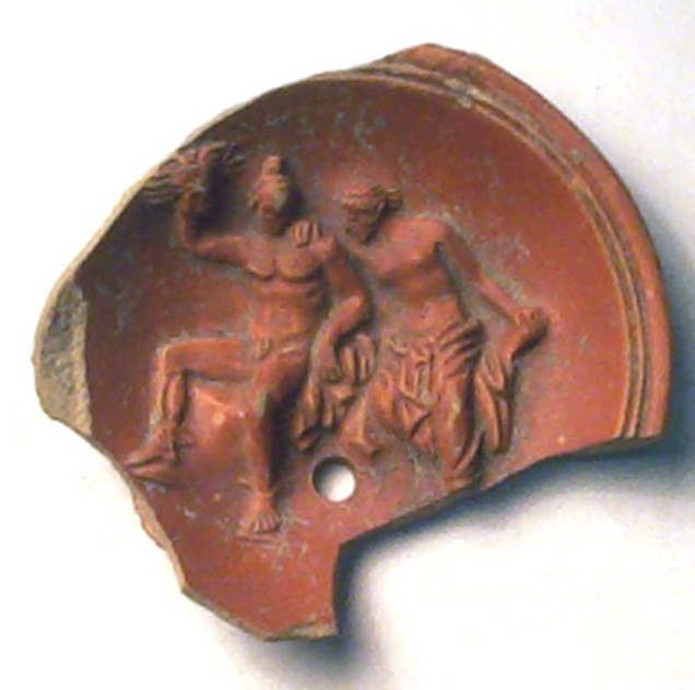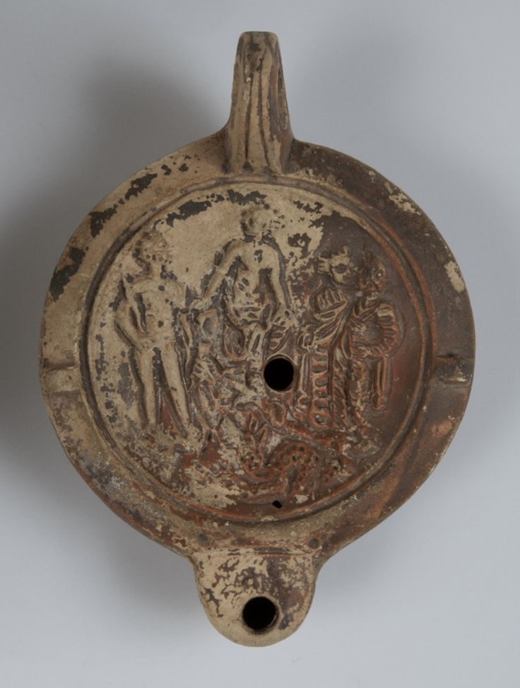 The lamp on the right, common shape of oil lamp that died out in the third century CE, this is a variation on the liberation composition of a mosaic viewed in week eight. The characters look as if theyre in conversation, reference to theatrical performance- what is also interesting is theyre included on the smaller medium of an oil lamp (not often found in larger compositions)