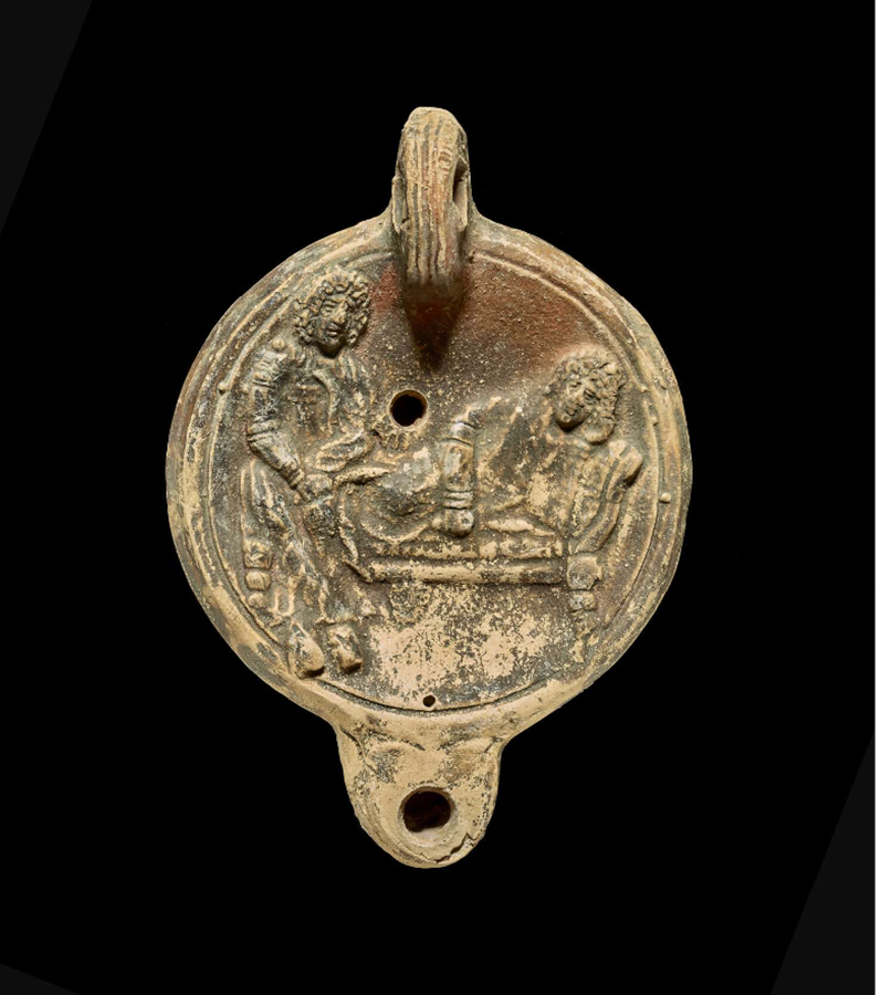 Oil lamp depicting Orestes and Pylades- wearing theatrical masks, ca. 175-225 CE.