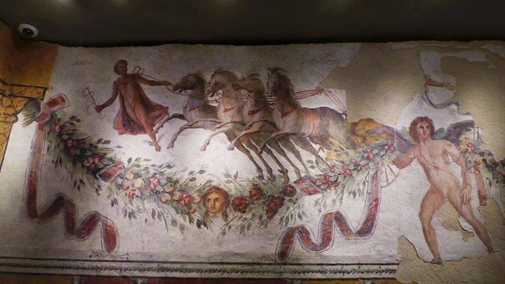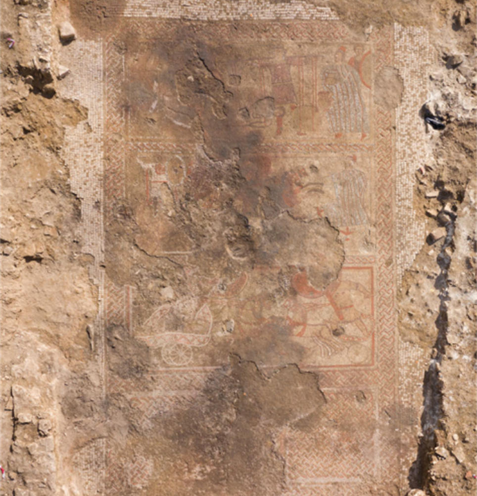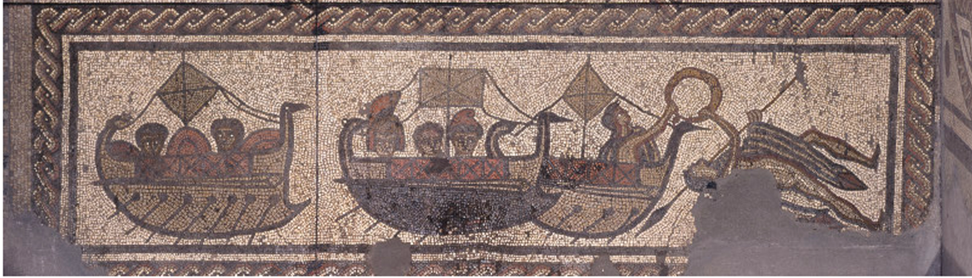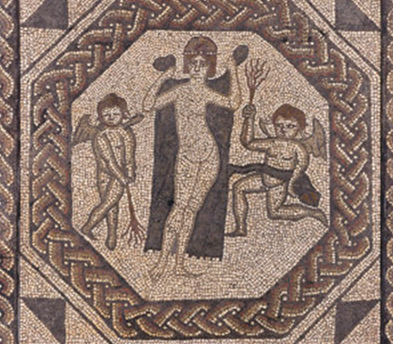 Dated to fourth century CE from a villa which seemed to have a bathing complex, attached to the main living area this mosaic was in the frigidarium