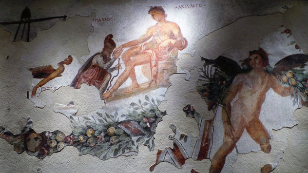 Achilles takes up a lot more space - possibly deliberate or could be a mistake in laying by the mosaicist?