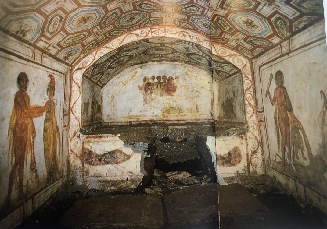 These paintings are in situ in a catacomb, they are dated to around the 4th century (later antiquity), this two had two special niches- art shaped recesses where the sarcophagus would have been placed